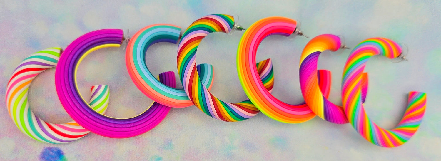 The Twisted Hoops bring the sculptural swirl, while our Ombre Hoops fade through 15 hand‑mixed shades for that perfect ombre look.