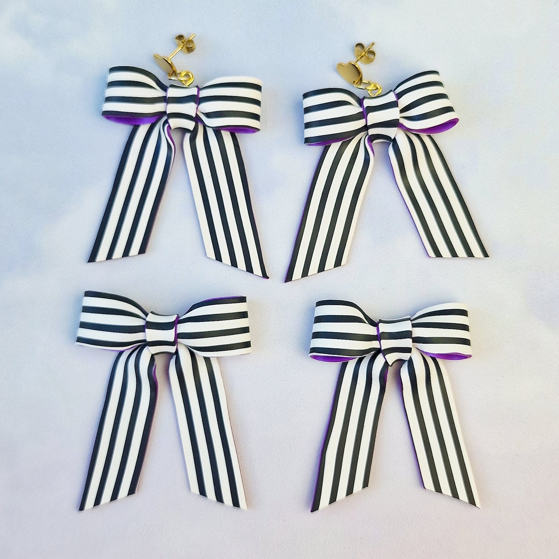 Tiny stripes, major charm. These mini black and white bow earrings are your monochrome moment with a twist of cute. Hand-sculpted from polymer clay and finished with love, they’re the perfect blend of graphic pop and girly sass.