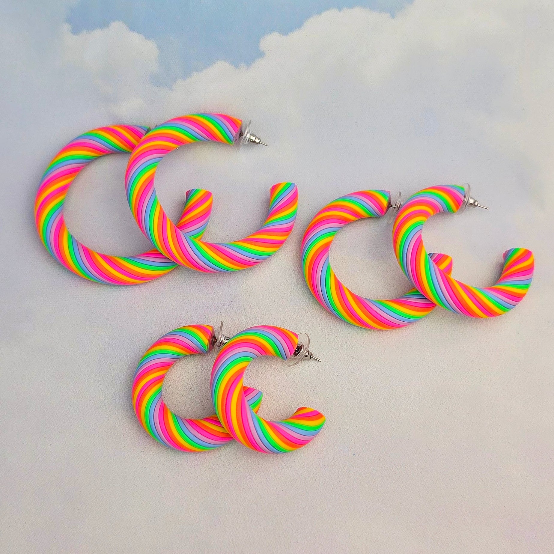 Handmade from 15 vibrant neon clay colours, these hoops are hand-twisted to create a textured ombré effect that’s full of movement and personality. Each pair is sculpted by hand, giving them a soft, organic feel and a joyful glow.