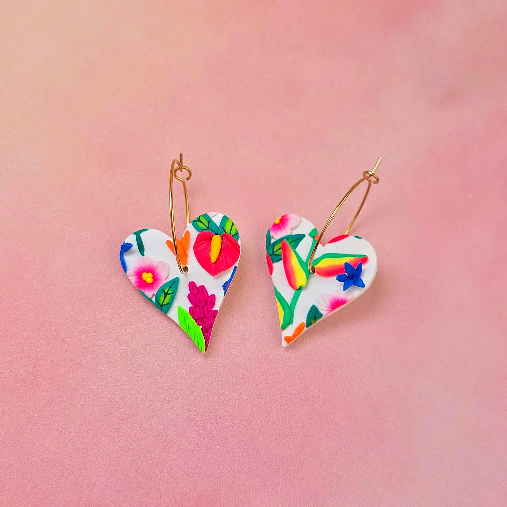 Each piece in this mini collection is crafted from a single tropical slab — a bright, joyful mix of hand‑sculpted florals and leave details. Because the slab is built entirely by hand and sliced only once, every pair is truly one of a kind. No repeats, no twins, no restocks — just little wearable artworks with their own personality.