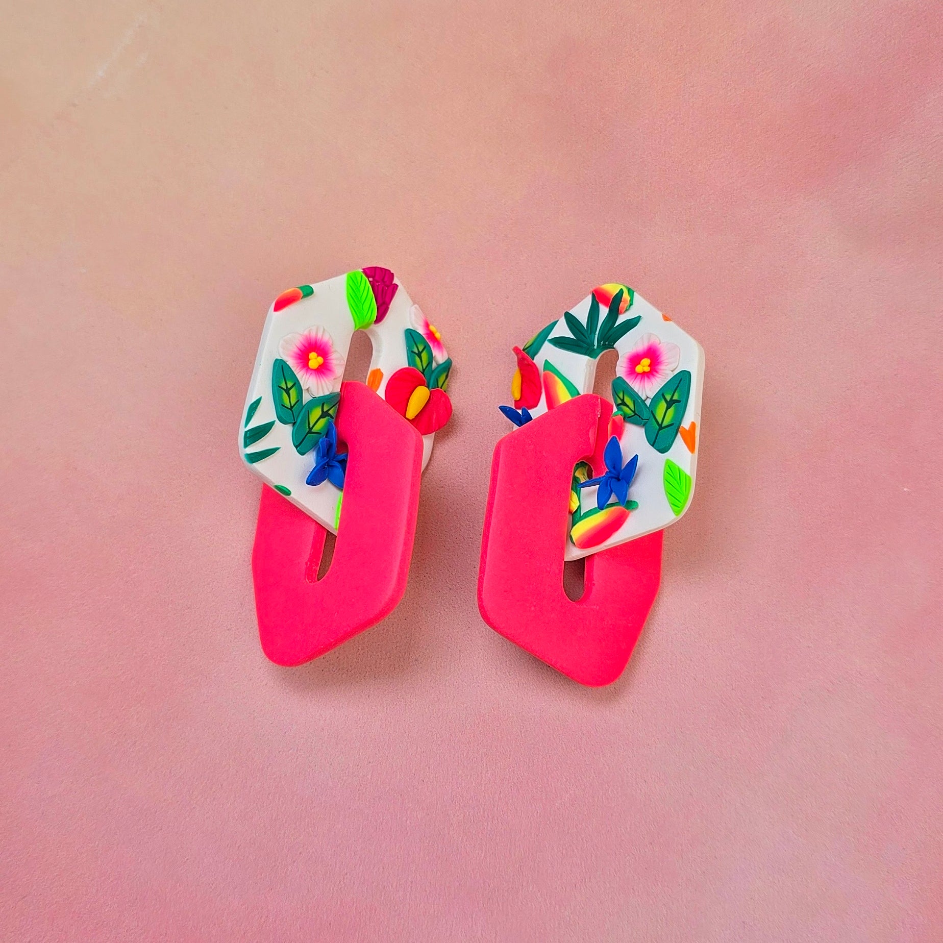 Each piece in this mini collection is crafted from a single tropical slab — a bright, joyful mix of hand‑sculpted florals and leave details. Because the slab is built entirely by hand and sliced only once, every pair is truly one of a kind. No repeats, no twins, no restocks — just little wearable artworks with their own personality.