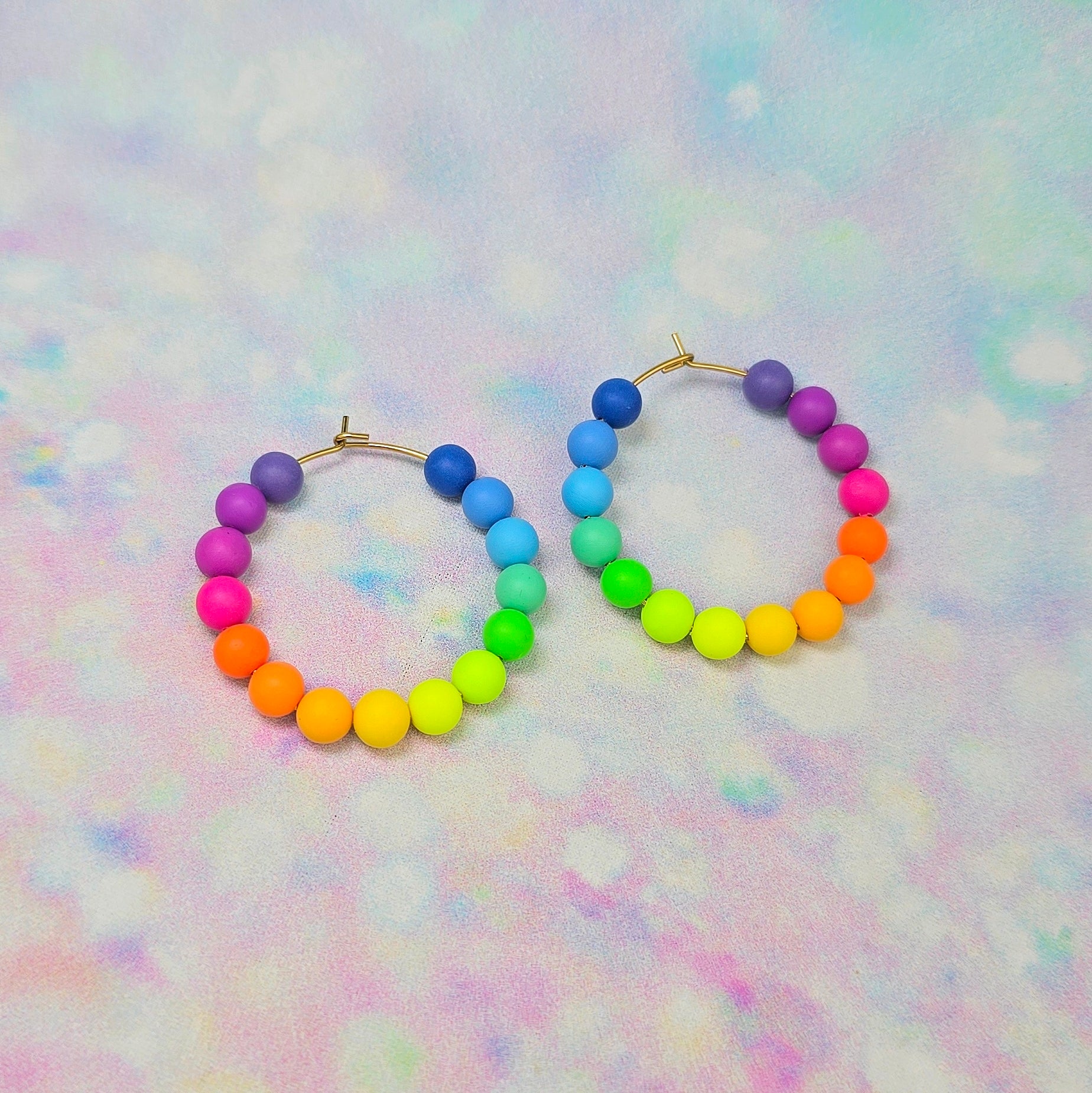 These Neon Bouquet Hoops are a playful twist on a classic — 30 hand‑rolled polymer clay beads threaded onto 40 mm stainless steel hoops, creating a vibrant, lightweight statement you’ll reach for again and again.